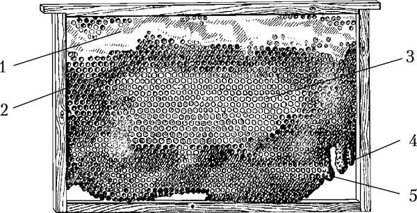 Рис. 3. Рамка с сотом: 1 – запечатанный мед; 2 – перга; 3 – расплод печатный; 4 – роевые маточники; 5 – маточные мисочки
