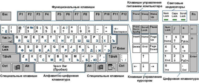 Несмотря на множество отличий по внешнему виду и эргономическим свойствам (см. предыдущий раздел), структура всех клавиатур примерно одинакова. Ниже приводится перечень групп клавиш, имеющихся у любой стандартной клавиатуры: