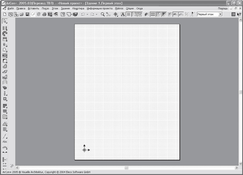 После задания настроек проекта (в окне Свойства этажей необходимо нажать кнопку ОК) открывается документ с пустым листом (чертежом) плана, а главное окно программы при этом должно значительно преобразиться и выглядеть, как на рис. 1.4. Кроме того, системное меню значительно пополняется новыми разделами.