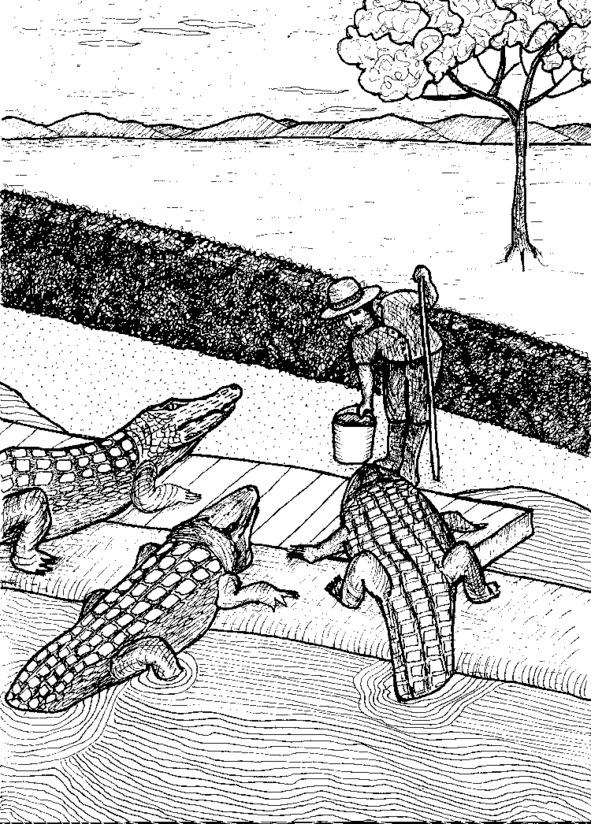 Когда мы прибыли, я увидел загон, где живут в воде крокодилы. Он просто кишит ими. Есть загон для маленьких. Хозяин рассказывает, что влияет на их кожу. Кожа огромных старых самцов крокодилов, у которых грубые толстые наросты, идет на панцири и другие серьезные изделия. А кожа молоденьких крокодильчиков более тонкая, нежная, совсем светлая, бывает разных цветов. Крокодиловое мясо тоже используют, местные едят. Работа опасная. Мы постоянно находимся под надзором в одной клетке с этими монстрами. Нельзя зевать ни минуты — или окажешься в пасти чудовища. Они не нападают часто, но возможность такая всегда есть, поэтому надо быть очень аккуратным. Не знаешь, что придёт в голову этим зверюгам. Я нахожусь в постоянном напряжении, всегда начеку, в состоянии охоты и обороны, это очень заводит. Это сделало меня самого резким, агрессивным. Я сам стал похож на крокодила, и мне нравится их убивать, давая выход адреналину. Года два я занимался кормежкой, отловом, сортировкой, наблюдением. Только потом меня научили, как их правильно убить и разделать. Однажды у меня на глазах крокодил сожрал моего товарища — схватил его за ногу и утащил. Очень сильный, мощный крокодил — мы не смогли спасти товарища: держали его за руки, но крокодил всё равно вырвал у нас тело и утащил. Другие крокодилы тоже бросились, чтобы схватить добычу, но этот большой уволок ее в воду. Он не может расцепить пасть, чтобы обороняться от других крокодилов, ведь тогда он выпустит добычу. Вода бурлит, словно вскипая, зверюги дерутся, шлепают хвостами.