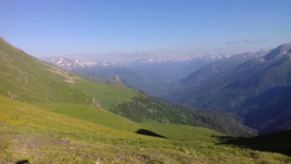 Наутро продолжаем подъем. Вскоре пересекаем верхнюю границу леса, обрамленную полосой высокогорной березы, клена, рябины. Начинаются субальпийские поляны с огромными трехметровыми борщевиками и девясилами. Затем входим в пояс альпики. Троп вокруг столько, сколько заблагорассудилось их протоптать коровам. Одна из троп, берущая правее косогором, — более торная. Это вьючный тракт южного склона Аибги, сообщающий между собою его коши. Тропа идет совсем близко к верхней границе леса. Временами лес прерывается, и тогда открываются далекие виды. Вот справа открылись крохотные домики и петли реки. Это Псоу. Значит, мы где-то внизу обогнули хребет.