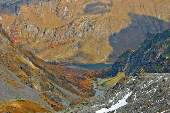 Мы не будем здесь ночевать, лучше пройти до водопадов. По тропе от озера выходим на кругозор. Внизу, в ошеломляющей глубине лежит долина Бешенки и поселок. Правее видна цепочка вершин хр. Ачишхо, главная вершина — самый правый скалистый пик. Правее просматриваются розовые скалы Фиштинского массива. На севере в зеркале озера отражается громада Чугуша, вправо от него выстоились в ряд вершины ГКХ, особенно впечатляет снежно-ледовая группа вершин Псеашха. Вдали видны вершины Кардывачского узла.