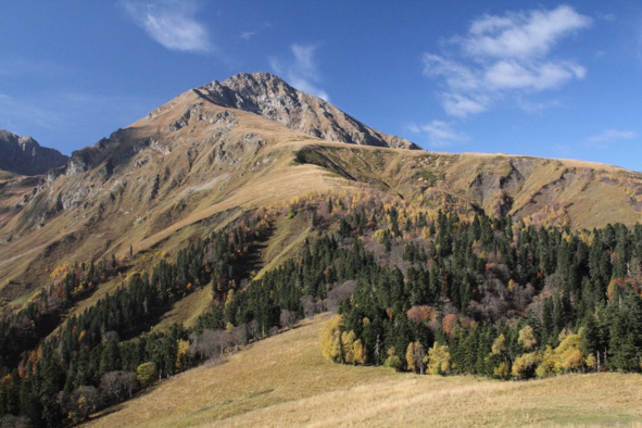 Наутро продолжим набор высоты по такой же крутой тропе, вскоре она выводит на субальпику хр. Псекохо. Открывается вид на окрестные вершины: на юго-западе видна Аибга, на северо-западе Ассара, Чугуш, пик Воробьева. Перед сглаженной вершиной 1652 м (самой высокой точкой хребта) тропа расходится: одна идет через вершину, другая обходит ее слева. Обе тропы вновь соединяются на седловине за вершиной. Здесь последняя широкая ровная полянка (6 км и 4,5 часа от Сланцевого Рудника) перед затяжным подъемом к лысым вершинам урочища Медвежьи Ворота, которые расположены более чем на 500 м выше нас. Здесь заночуем. Лес немного поредел, все больше стало попадаться хвойных пород. На северо-западе сквозь деревья хорошо виднеется массив Ассара (2633 м).