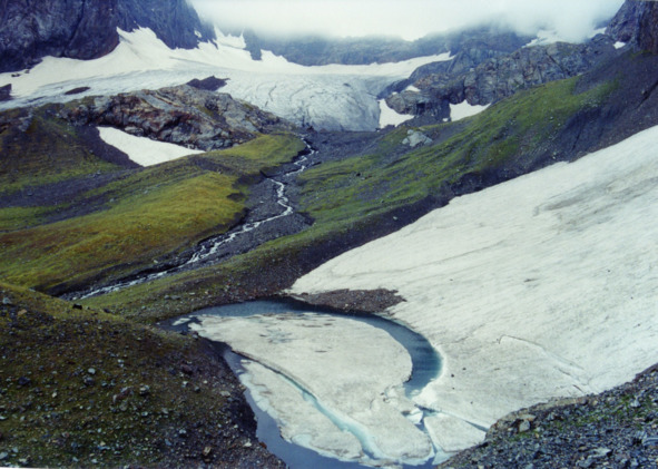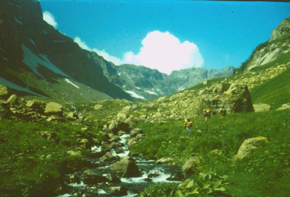 Слева осталась группа следующих кошей, расположенных на мысовидном отроге. В 200 м под отвесом расположилась огромная циркообразная чаша с вертикальными стенами и привольным луговым дном, на середине которого лежат обширные снежники. Дно цирка — балкон над следующим ярусом круч. Создается ощущение полета всего этого горного мира над лежащими внизу долинами.