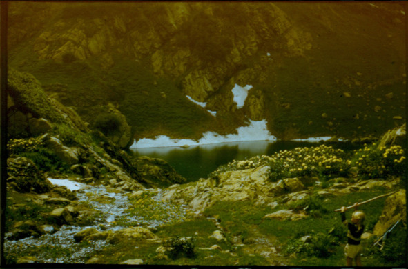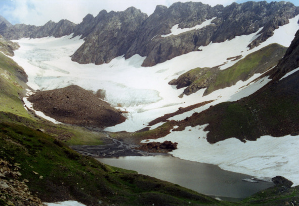 Озеро (2077 м, 6,5 часов) открывается неожиданно и сразу захватывает своей густой синевой. Прямо из зеркала озера торчит большой камень, до конца лета плавают снежные «айсберги». Его площадь 6000 м2. Еще одно озеро, помельче, залегает на вышерасположенной террасе. Подобно оз. Альбова оно имеет ту же форму, такой же камень посередине, тот же ультрамарин воды. Грозна подкова скально-снежных стен Ацетуки. На северном берегу в высокой траве ищем место для палаток.