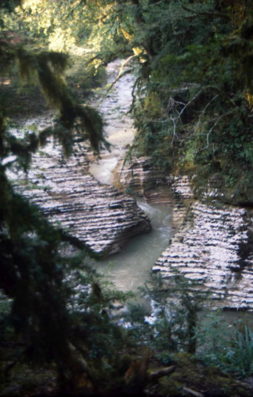 Долина Псоу в этих местах очень красива. Река бьется в узком каньоне на 200-метровой глубине, стены так сблизились, что кажется, упади могучая пихта на одном берегу, коснется верхушкой другого. Это Шахгинское ущелье, где живописные скальные участки сосредоточены на 15 км.