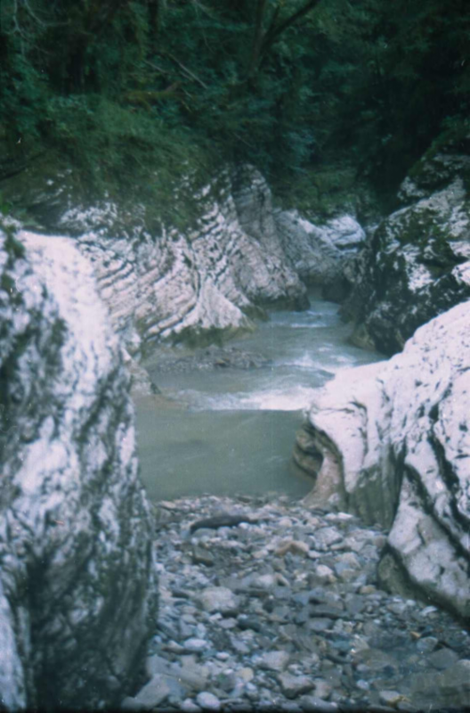 Ввысь поднимаются ослепительно белые стены, украшенные затейливым орнаментом известняковых складок. Белизна резко контрастирует с зеленью всех оттенков. На дне беспрерывные уступы, ванночки, водопадики, бурлящие котлы, тихие заводи, отполированные водой плиты.