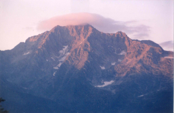 Слева открылись крутые луговые склоны Аибги — какая она отсюда монотонная! Где ее пирамиды? Вдруг над склонами возникает дивно вознесенная, царящая над миром раздвоенная вершина. Она одна в небе. Это Ахаг. А за ним граненая Арабика и грозные вершины Гагрского хр.