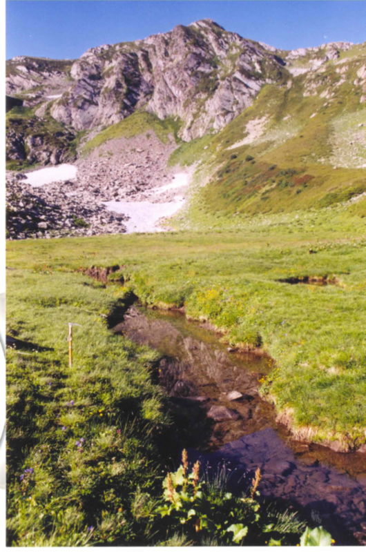 Наутро уходим с гостеприимной поляны. Временами проявляется тропка, но больше приходится продираться сквозь заросли орешника, малины, ежевики, лавровишни. Переходим вброд левый исток Тихой и доходим до места слияния истоков (1529 м), оттуда сворачиваем вправо и на лугу отыскиваем тропку. Вокруг паутина кабаньих троп, сбивающих с пути. Впереди лесистый отрог. Раньше через него шла тропа, сейчас она едва видна. Направление подъема (набор высоты 200 м) — на самый край отрога. Уже наверху обходим справа лесной завал и по четкой тропе, которая неожиданно проявилась, за 20 минут спускаемся к Тихой (1710 м, 3 часа от Оленьей пол.), здесь же переправа по упавшему стволу. Отсюда видна заснеженная вершина Ацетуки. Дальше будет большая Лошадиная пол. с громадным камнем посередине, он напоминает с севера человеческий профиль. Под камнем ниши, где в непогоду может укрыться группа. Поляна окружена пихтами, березами, встречается ель. Разнообразна луговая растительность. Прелесть поляны дополняет голубая речка, которая весело бежит у края изумрудной луговины.