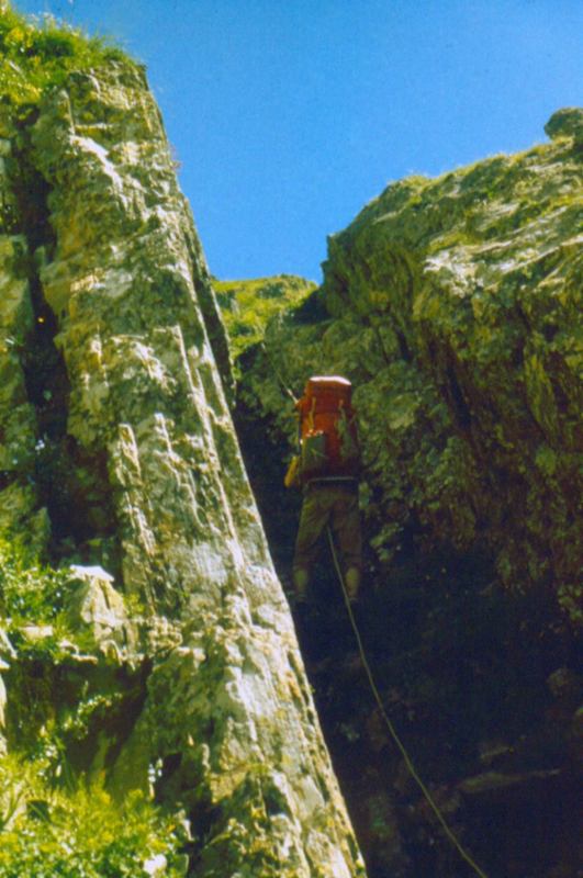 Водораздел Длинной и Тихой порос лесом, чтобы попасть в соседнюю долину, нужно одолеть этот хребет. Подъем идет прямо от поляны с пихтами среди зарослей и завалов. Подлесок — главная трудность хождения без троп. За 1,5 часа выходим на водораздел (1900 м). Выбрав удобную террасу, быстро теряем высоту. Спуск по некрутому лесному склону с редким подлеском занимает 2 часа. Выходим на действительно тихий берег Тихой (1470 м). У самого берега попадаются следы старой тропы. Идем то у самой воды, то обходим прижимы. Скоро «цветочная» поляна. Еще полчаса ходу по кое-где видимой тропке и мы оказываемся на большой Оленьей пол. (1510 м, 7 часов от места предыдущего ночлега). Здесь разбиваем лагерь.