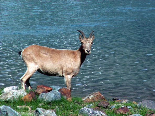 С перевала идем траверсом влево к спрятанному в соседнем цирке Голубому оз. (1 час спуска). Оно лежит в нижней ступени кара на высоте 2254 м. Его площадь 18 000 кв. км, глубина до 15 м. Вода удивительно чистая, дно видно до 13 м. Температура поверхности до 10°. В озере водится форель. С северной стороны озеро подпружено ригелем. На южной стороне к нему ниспадают три лавинных снежника. Вокруг кольцо Турьих Гор. Высота этих труднодоступных гор не превышае