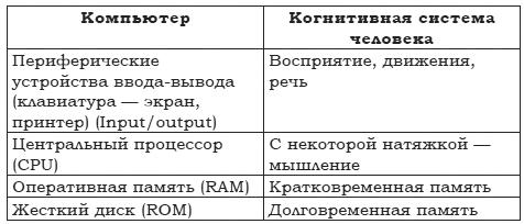 Описание процессов переработки информации, связанных с кодированием, наталкивает на аналогию с работой компьютера. И это не случайно. Компьютерная метафора – один из самых заметных теоретических тезисов ранней когнитивной психологии. По определению Аристотеля, метафорой является использование слов в переносном значении. Для пояснения сложной мысли мы можем уподобить непонятное чему-то более простому и знакомому. Тогда для пояснения своей мысли мы выстраиваем аналогию между понятным и хорошо известным предметом (его называют источником) и предметом, свойства которого нужно пояснить (целью). Например, «мой адвокат – настоящая акула» или «время – деньги». В первом примере метафора переносит свойства агрессивности и «зубастости» на адвоката, во втором – подчеркивает ценность времени и невосполнимый характер его потери. Компьютерная метафора – это содержательная аналогия между человеческим познанием и переработкой информации компьютером.
