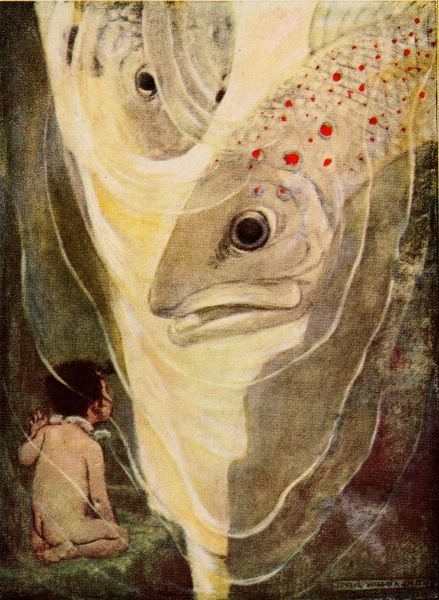 Then he asked her where she lived, and she said far away by the sea. And Tom asked her about the sea; and she told him how it rolled and roared over the rocks in winter nights, and lay still in the bright summer days, for the children to bathe and play in it; and many a story more, till Tom longed to go and see the sea, and bathe in it likewise.