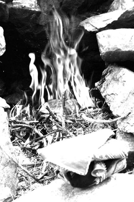 Уже втроем они вернулись в деревню, и эта женщина какое-то время там жила. Но потом народ обозлился на нее и решил сжечь за шаманские дела. Люди развели большой костер, чтобы туда ее бросить. Она не сопротивлялась, но велела, чтобы ее сожгли за рекой, иначе в реке исчезнет рыба. Никто ее не послушал. Однако ее предсказание сбылось: рыба исчезла, и начался голод.