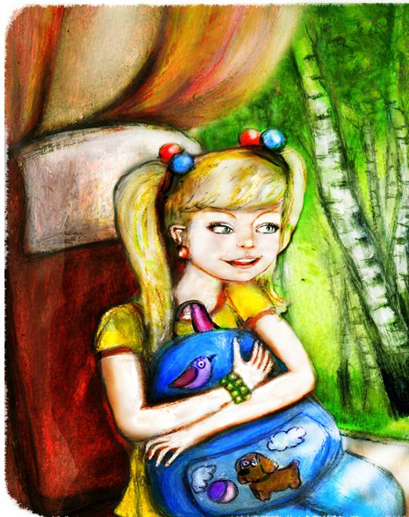 Маша пошла с пакетом в спальню, где стояла высокая кровать с множеством подушек и подушечек в нарядных вышитых наволочках. Достала домашнее платьице с карманами и посмотрела в окно. На яблоне сидела глазастая ворона с зелёной краской на крыле и следила за девочкой.