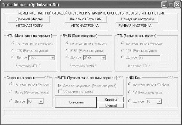 Turbo Internet (http://optimizator.ru) предназначена для оптимизации параметров подключения к Интернету (рис. 1.5). Утилита может работать в ручном и автоматическом режимах. В главном окне Turbo Internet расположены кнопки, с помощью которых можно вручную установить способ подключения к Сети. В зависимости от типа подключения компьютера к Интернету нужно выбрать наиболее оптимальный способ соединения. Кнопка Наилучшие настройки предназначена для пользователей, способных задать параметры соединений вручную.