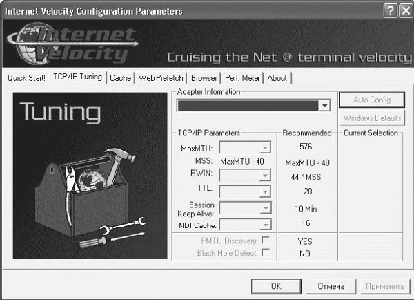 Настройки интернет-соединений возможны на вкладке TCP/IP Tuning. Выбрав устройство (модем или сетевую карту), можно задать значения полей MaxMTU, RWIN, TTL и др. (рис. 1.6).