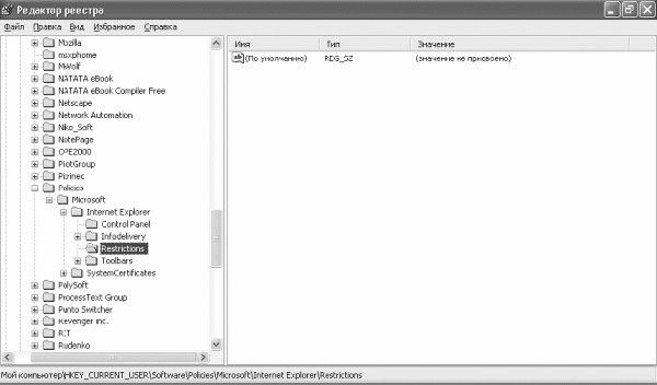 В Windows есть возможность запретить (или разрешить) доступ к свойствам обозревателя Internet Explorer (Сервис ► Свойства обозревателя). Для этого в разделе HKEY CURRENT USER\Software\Policies\Microsoft\Internet Explorer\Restrictions нужно создать строковый параметр NoBrowserOptions со значением 1. Затем откройте раздел реестра HKEY_CURRENT_USER\Software\Policies\Microsoft\Internet Explorer\Control Panel (рис. 2.2).
