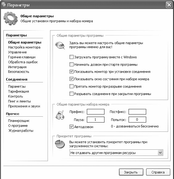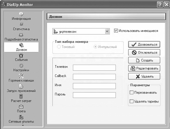 В разделе Статистика можно просмотреть детальную статистику по трафику и увидеть график загруженности интернет-канала. Детальную информацию по месяцам можно просмотреть в разделе Подробная статистика. Программа способна автоматически дозваниваться до провайдера по всем указанным соединениям, при этом в окне ее настроек можно задать все необходимые параметры: номер телефона, логин, пароль, необходимость повторного дозвона при наличии обратного звонка. DialUp Monitor позволяет использовать имеющиеся в системе номера дозвона, а также добавлять и настраивать новые непосредственно в окне программы (рис. 1.8).