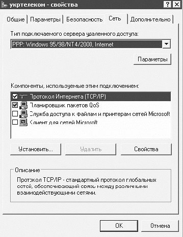 – Тип подключаемого сервера удаленного доступа (вкладка Сеть) – PPP: Windows 95/ 98/NT4/2000, Internet (рис. 1.2);