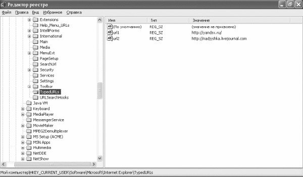 Internet Explorer сохраняет в своей адресной строке последние введенные пользователем адреса, список которых можно отредактировать и удалить ненужные ссылки. Для этого в разделе системного реестра HKEY_CURRENT_USER\Software\Microsoft\Internet Explorer\Typed URLs (рис. 2.3) следует удалить ненужные параметры.