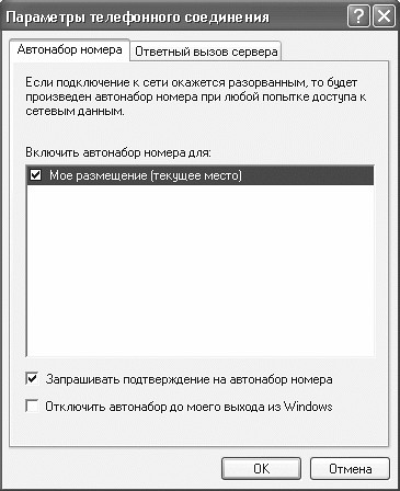 Функция автодозвона позволяет существующему подключению автоматически набирать номер телефона и соединяться с провайдером в случае разрыва связи, а также при любой попытке доступа к сетевым данным. Чтобы настроить автодозвон, на Панели управления необходимо выбрать категорию Сеть и подключения к Интернету, выделить нужное подключение, затем выполнить команду Дополнительно ► Параметры удаленного доступа. Для установки автонабора в области Включить автонабор номера для нужно установить флажок дозвона (рис. 1.1).