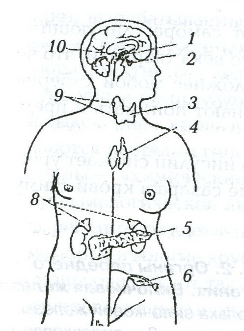 В эндокринную систему входят: гипоталамус (подбуторье) — часть центральной нервной системы; гипофиз; шишковидное тело (эпифиз); щитовидная железа; паращитовидные железы; островковый аппарат поджелудочной железы; надпочечники; яичники (яички); вилочковая железа.
