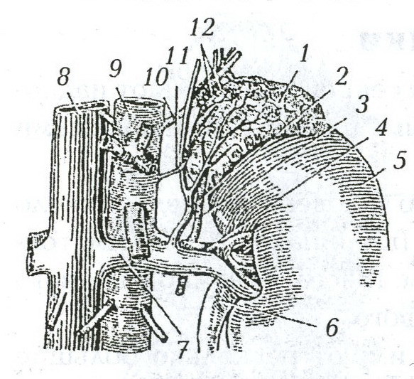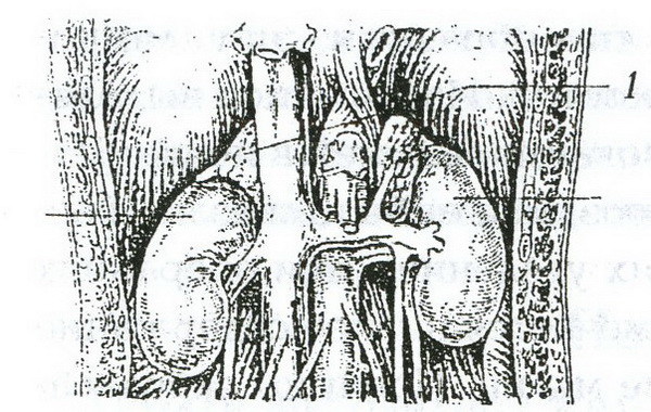 Рис. 4. Надпочечники, gll. suprarenales(1), и почки, renеs(2); вид спереди