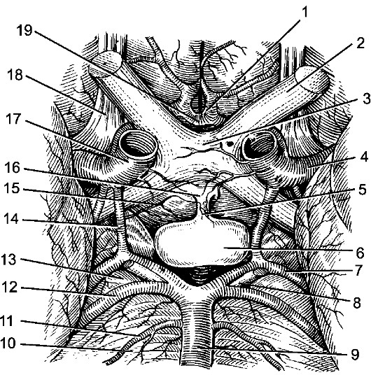 Рис. 2. Органы переднего средостения. Вилочковая железа.