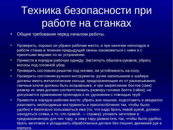 Переходим конкретно к технике безопасности при работе на токарных и других станках. Есть ли инструкции в близи станка зависит от начальника. При нормальном, нудном начальнике она всегда есть и не одна. Помню я в начале своей токарной деятельности не любил их учить. Потом до меня дошло то что их не надо тупо наизусть знать не понимая смысла. Нужно её не любимую осмыслить и принять как наставление по сохранению твоей жизни. Как заботу начальника о тебе и своей заднице. Все инструкции говорят писаны кровью. Это конечно так. После каждого аварийного случая происходит расследование по какой причине разгильдяй токарь включил станок с ключом в патроне. После этого будет написано на бумаге как это не делать. В общем инструкции это повесть о головотяпстве рабочего класса Земли. Зная и соблюдая инструкцию, ты не повредишь свои органы тела, значит воздействуешь благоприятно на демографию и процветание Планеты. Посмотрите моё видео наставление по этому случаю для информации https://youtu.be/gkTLiFT2v90 и воспользуйтесь.