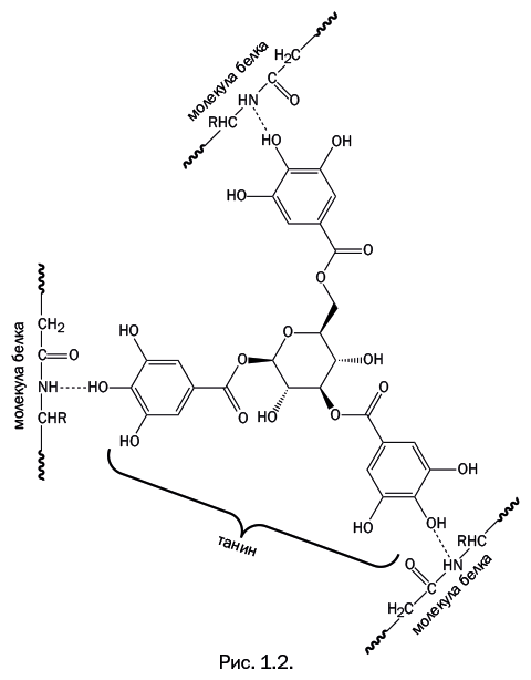 Одно из наиболее эффективных дубильных веществ, употреблявшихся в древние времена, содержалось в коре дуба, а также в чернильных орешках, образующихся иногда на дубовых листьях. Так появилось слово "дубление". Отвары коры или орешков добавляли в чан с вымоченной кожей. В более поздних исследованиях было выявлено и действующее вещество — танины. Эта группа соединений представляет собой связанные бензольные ядра, содержащие гидроксильные группы, то есть фрагменты -С6Н4-ОН. Пример одного из веществ этой группы показан на рис. 1.2.