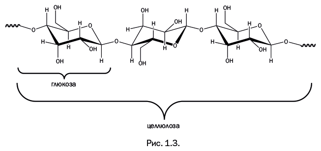 Предметы из целлюлозы постоянно окружают нас в повседневной жизни: 40–60% древесины состоит из целлюлозы, в хлопковой вате ее содержание — 96–98%, а ворсинки тополиного пуха — это практически чистая целлюлоза. Линейная полимерная молекула целлюлозы собрана из циклических молекул глюкозы (рис. 1.3), молекулярная масса — от 400 000 до 2 млн, а сама молекула напоминает бусы.
