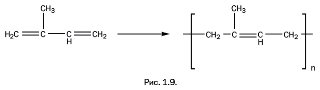 Современная химия только подтверждает, что найденный Гудьиром вариант был исключительно удачным. Исходный мономер изопрен содержит две двойные связи, соединенные одинарной. При его полимеризации образуется полиизопрен — натуральный каучук. Это полимер линейного строения с чередующимися двумя простыми и одной двойной связями в цепи (рис. 1.9).