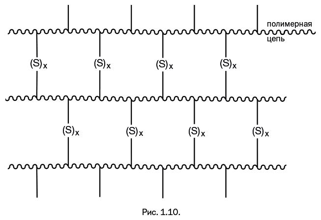 Молекула натурального каучука содержит 20 000–40 000 элементарных звеньев, молекулярная масса — 1 400 000–2 700 000, и он хорошо растворяется в большинстве органических растворителей. При вулканизации кратные связи, присутствующие в цепи полимера, взаимодействуют с серой, при этом возникают поперечные мостики, содержащие несколько атомов серы (рис. 1.10).