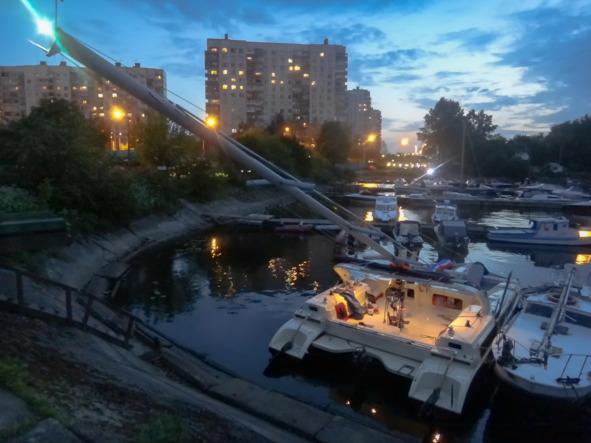 Нам нужно идти с Васильевского острова через весь город в Ладожское озеро. Основная трудность этого пути — питерские мосты. Известно, что они разводные, но, оказывается, за проход под раскрытыми мостами нужно заплатить. Так сказал наш лоцман — Витя. Поэтому нужно «срубить» мачту. Это значит, что с неё нужно снять всю оснастку, паруса и откинуть назад, оперев на спойлер (небольшая крыша над кокпитом). Вечером перед выходом с помощью ещё двух человек из марины мы эпично это сделали. На сетках лежат паруса. Тент собран и лежит на спойлере. Там же поперек лежит гик и на нем сверху — мачта. Всё это привязано веревками к судну. Катамаран приобрел вид скоростного, но бомжеватого парохода. В таком виде появилась возможность поправить наши ходовые огни, которые светят как попало. Это выяснилось при тестовом выходе в Финский залив, когда сопровождавшая нас моторная лодка не смогла по нашим ходовым огням определить, в какую именно сторону мы двигаемся. Подошли кормой к высокому берегу, поставили поудобнее сходни, и Витя их отрегулировал. Оглядев то, что получилось, мы немного порассуждали о том, пройдем мы под мостами или нет. Это выглядело странно, если учесть, что единственный из нас, кто ходил под этими мостами, это Витя.