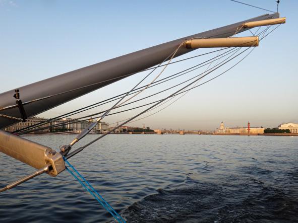 Вышли почти вовремя. В Неве сразу возник мост. Мне стало очевидно, что мы не пройдем под ним. Стало смешно вспоминать вчерашние рассуждения, но смеяться совсем не хотелось. Витя, как настоящий профи, не подал и вида, что он сомневается. Мы медленно двигаемся на моторе под мостом, и вот под него начинает входить мачта. Расстояние между мачтой и мостом всё меньше и меньше. Раздается звонкий звук. Антенна на мачте зацепляется за мост. Почти случайно в этот момент я стою на корме за рулевым и, чтобы не упасть, держусь за свисающие ванты. Остаётся только подогнуть ноги. Я вывешиваюсь на мачте. Она прогибается, и мы проходим под мостом, больше не цепляясь за него. Следующие четыре моста мы проходим точно также, только виснем на вантах вдвоём с Олегом. Витя на штурвале.