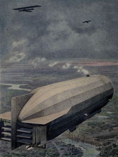 A great war Zeppelin on a bomb-dropping expedition is sailing over an enemy city. High above it are the city's defending aircraft—a biplane and a monoplane—ready to attack the raider with their machine guns