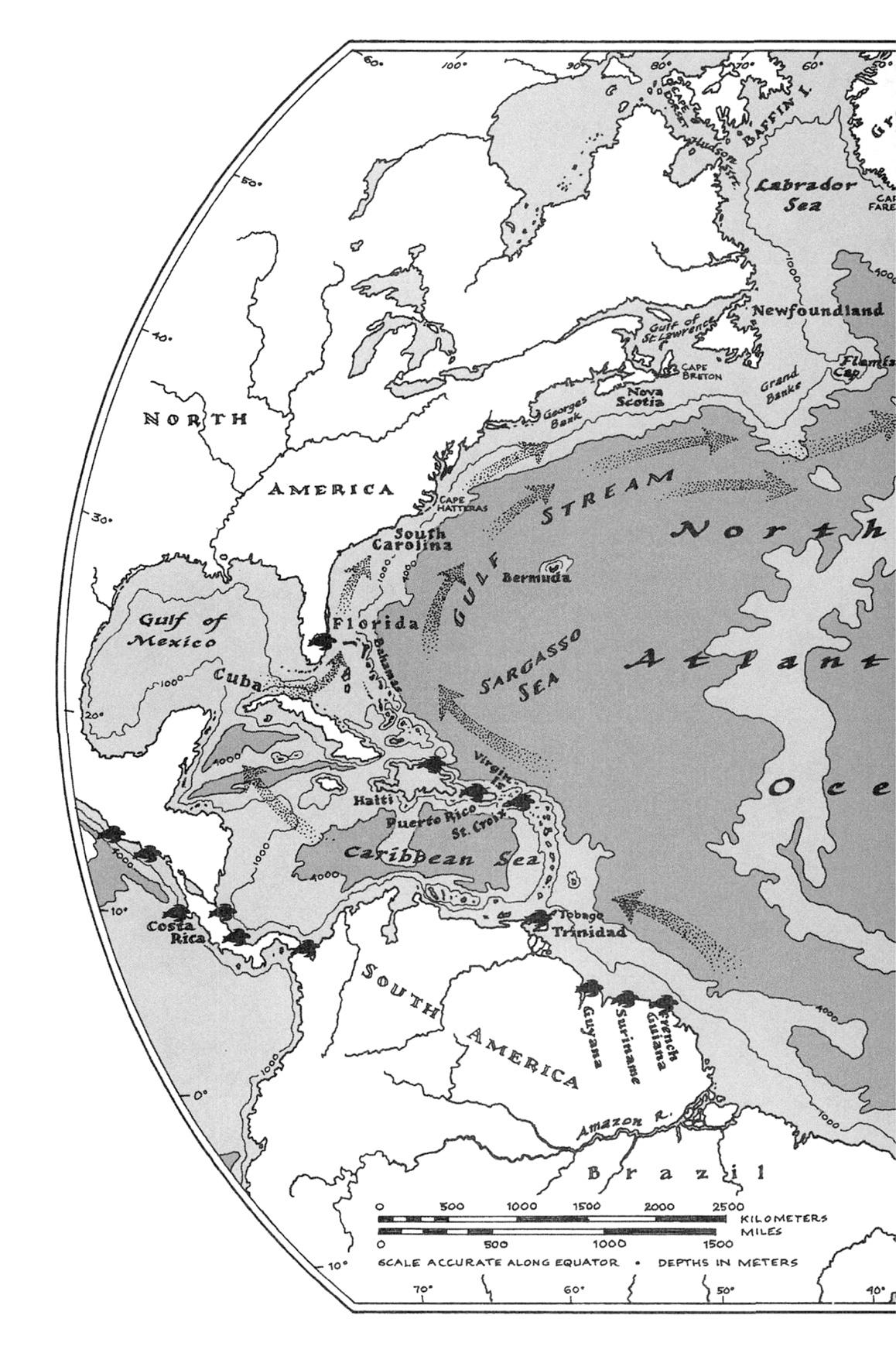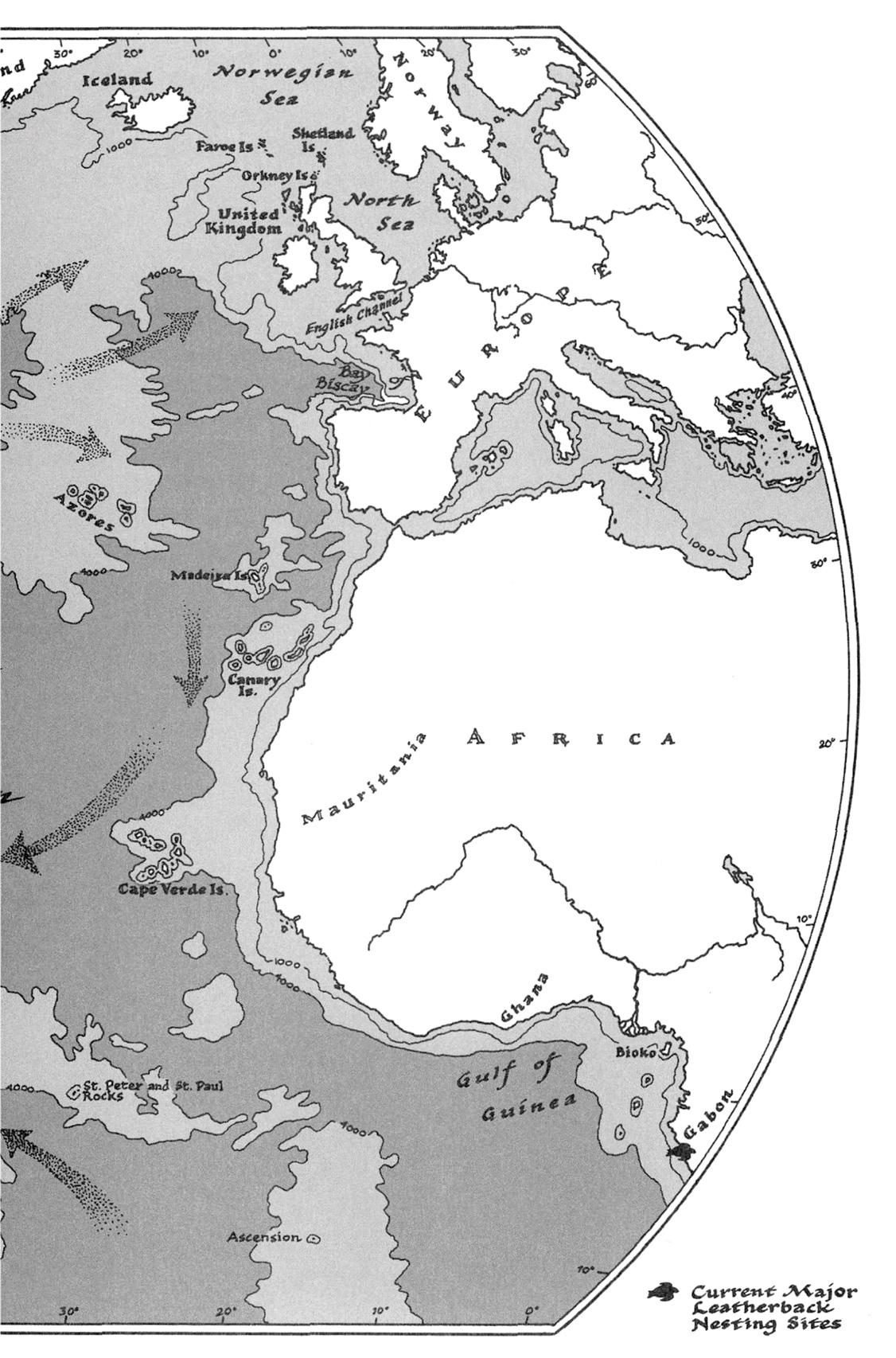 Большинство морских черепах так или иначе следует этому плану. К примеру, детеныши логгерхеда покидают юго-восточное побережье США и попадают в течение Гольфстрим, которое несет их на северо-восток, к водорослевым плотам Саргассова моря. Там они медленно кружатся, пока их не сносит в сторону Азорских островов и не несет дальше, минуя Португалию, на юг — в сторону Канаров и островов Зеленого Мыса, вдоль подводного побережья Западной Африки. Немало логгерхедов, родившихся в Америке, попадает в Средиземное море [11] — в отдельных местах они составляют половину всех логгерхедов, которые погибают от рыболовных крючков. К тому времени, как детеныши снова начинают двигаться на запад, в Северную Америку, чтобы стать полноправными охотниками на криль континентального шельфа, проходят годы, а иногда и целое десятилетие.