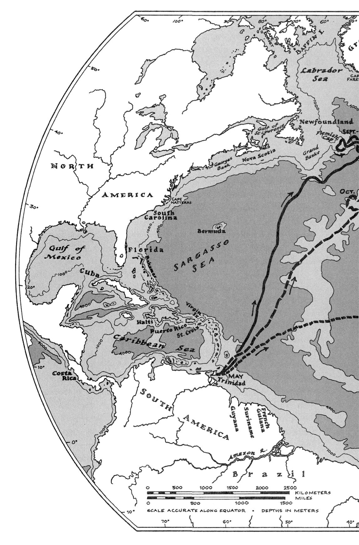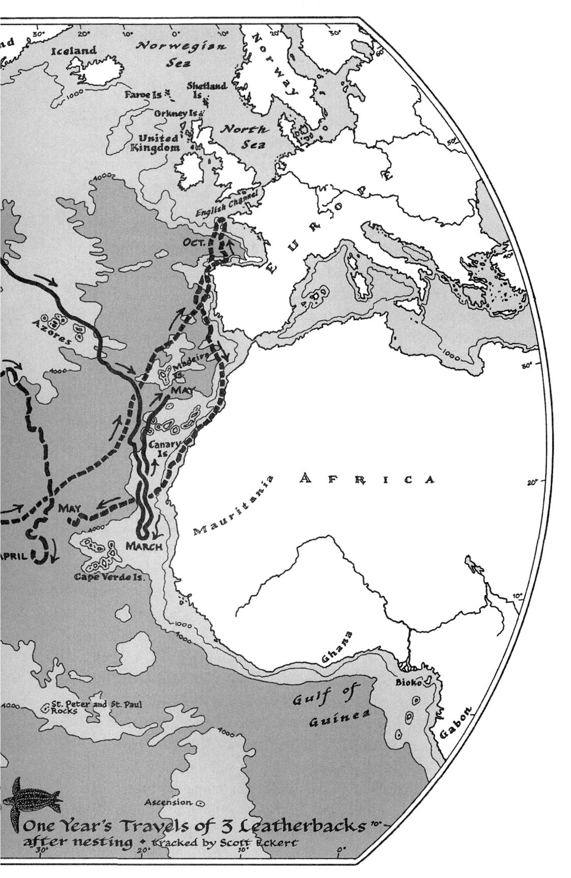 Скотт уже отслеживал кожистых черепах из Матуры. От их путешествий просто дух захватывает: одна проплыла из Карибского бассейна мимо Большой Ньюфаундлендской банки в Канаде далее на восток, к банке Флемиш-Кап — по сути, середине Атлантического океана, — затем к Азорским островам, островам Зеленого Мыса и в Мавританию. Другая плыла против Североэкваториального течения, достигла Бискайского залива между Францией и Испанией, а потом уже отправилась мимо Западной Африки к островам Зеленого Мыса. Тысячи километров.