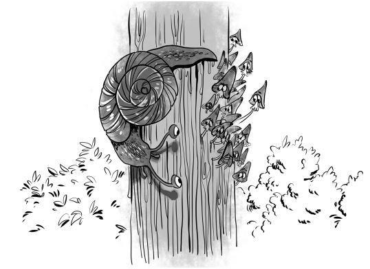 Немо указал на ствол, из которого вылезало целое скопление глазастых сиреневых грибов. Здоровенная улитка с печальной мордой в один миг слизнула их все и кровожадно глянула на друзей. Попятившись, Немо и Луна уперлись во что-то холодное и скользкое, сплошь покрытое листвой.