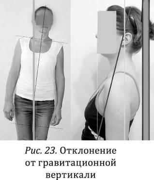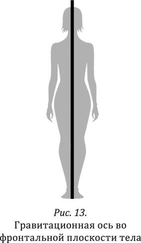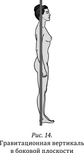 С точки зрения биомеханики эталонная ось, обеспечивающая правильную осанку, делит пополам переднюю поверхность тела через промежность и переносицу. А в боковой плоскости она проходит через несколько ключевых точек: центр наружного слухового прохода должен находиться на одной линии с головкой плеча, головкой тазобедренной кости и серединой пятки (рис. 14).