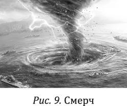 Ученым пришлось поискать ответ на простой вопрос: почему деревья растут вверх? Оказывается, деревьям помогают расти те же силы, что вытягивают, к примеру, торнадо или водяной смерч (океанический водоворот). Навстречу ему сверху вниз возникает нисходящий вихревой поток (так называемый антисмерч), который своим вакуумом вытягивает смерч вверх (рис. 9). Со стороны воздушная часть антисмерча абсолютно невидима, как не видны воздушные ямы и ветер. Но тем не менее она фиксируется приборами.