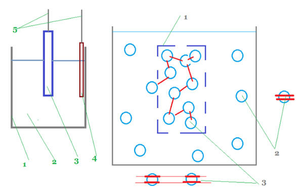 Left. Scheme of experiments by American physicists Fleischmann and Pons. 1. walls of the vessel, 2. deuterium (heavy) water, 3. cathode from palladium, 4. anode (positive electrode), 5. electric power supplyOn right. A possible explanation of the experiments of Fleischmann and Pons. 1. Schematic representation of the electrode from palladium – a porous vessel that absorbs and brings together microparticles, 2. molecules of water outside the cathode, to the right is a pictorial image of a microparticle with two active levels, 3. Water molecules that have the same energy levels enter a reaction, generate a cascade of resonant quanta. There is an anomalous heat release, without nuclear fusion. As described above, heavy water can be replaced by a conventional tap. Palladium in the simplest form is a porous (granular) medium. Another option – parallel, located at a short distance from each other mirror plates – resonators. If the circuit as a whole is correct, included in the electrical network in sequence, two Fleischmann and Pons generators will show the same picture as in experiments with capacitors filled with wet sand.