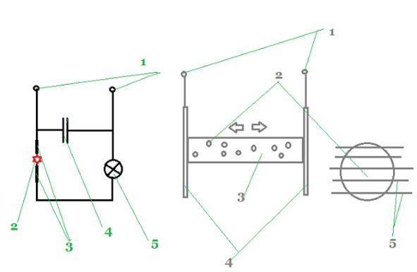 Figure on the left, the resonator of Chernetsky. 1. Power from a high voltage transformer, pulsating current. 2. Spark spark 3. Electrodes. 4. Condenser. 5. Active load, incandescent lamp. Picture on the right. A metal laser. An extended electrical circuit. 1. Nutrition. 2. Areas in the working body of the laser, lattice sites or domains having the same spectrum. 3. The conductor as the working body of a “metallic laser”. 4. Condenser plates like laser mirrors. 5. Schematic representation of the energy levels of interacting particles.
