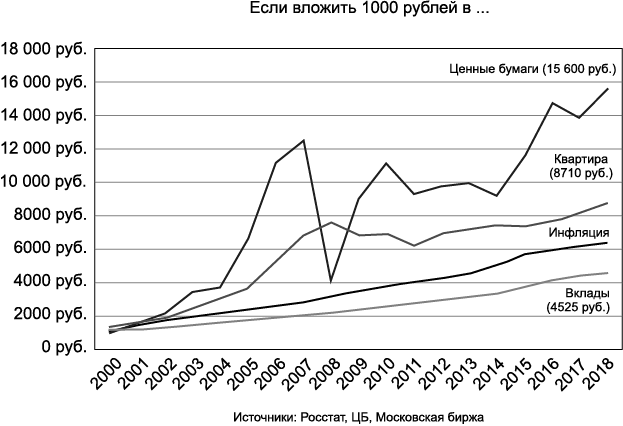 На более длинном отрезке времени соотношение доходности разных видов инвестиций можно проиллюстрировать следующим примером. В 2000 г. условные 1000 руб. вложены в разные инструменты: депозит сроком до года, квадратный метр в новостройке, индекс Московской биржи. Доходность каждого инструмента, а также данные по инфляции за тот же период приведены на графике (рис. 1.1).