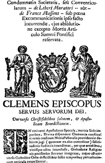 Правда, гонения обрушились на масонов во всех углах Европы и достигли своего апогея в выступлении римской курии. Папа Климент XII особой буллой от 7 апреля 1738 года обвинял свободных каменщиков (liberi muratori) в лицемерии, притворстве, ереси и извращениях. В особую вину им ставилась таинственность и скрытность. Виновным в принадлежности к масонству грозило отлучение.