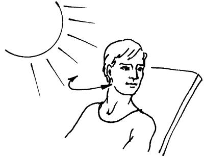 Сняв очки, усядьтесь поудобнее, откиньтесь назад, расслабьтесь, закройте глаза и подставьте лицо cолнцу. Чтобы избежать внутреннего вглядывания и слишком долгого воздействия света на какой-нибудь участок сетчатки, плавно, но довольно быстро двигайте головой из стороны в сторону до окончания солнечной ванны. Некоторые люди ощущают дискомфорт даже при закрытых глазах. В этом случае следует сначала обратить лицо не к солнцу, а к небу. Когда свет станет переносимым, можно ненадолго повернуться к солнцу. Если снова ощутите дискомфорт – сразу отворачивайтесь и закрывайте глаза ладонями. Длительность упражнения 1–2 минуты (рис. 1).