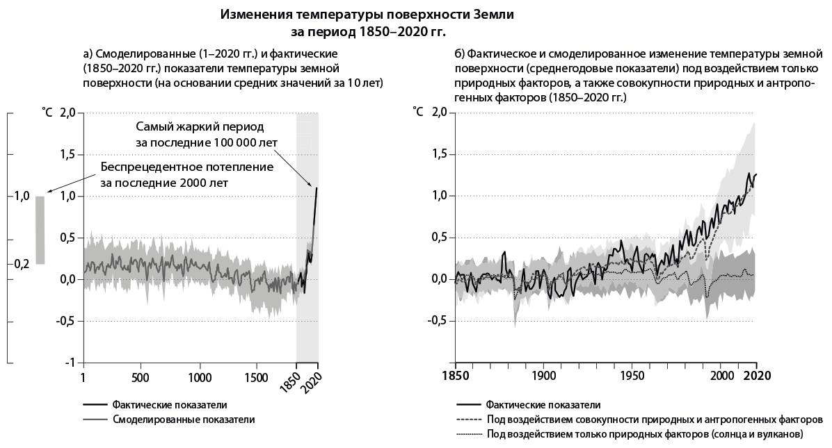 Рис. 1. Графики из VI Доклада IPCC о физических показателях изменения климата: слева — рост средней температуры на планете с начала нашей эры до настоящего времени; справа — сравнение последствий, обусловленных природными явлениями (без вмешательства человека), и последст