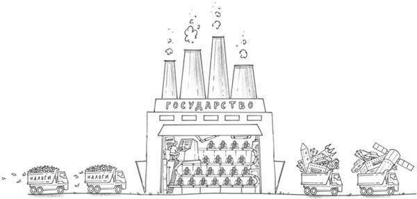 Для того, чтобы предотвратить это печальное положение вещей, и существует государство. По сути своей государство – это палка-погонялка, которая заставляет жителей страны участвовать в создании тех самых жизненно важных вещей, о которых мы говорили. Оно организует граждан страны для совместной деятельности там, где они сами скооперироваться не в состоянии. Государство – это единственная организация в стране, которая имеет право применять насилие против граждан. Представители государства – государственные чиновники внимательно следят, чтобы никто из жителей страны не нарушал ее законов, а также не уклонялся от уплаты налогов – денег, которые будут потом направлены на общие нужды. Эти же чиновники заставляют граждан страны идти в армию в случае войны, а в некоторых странах, включая Россию, и в мирное время.