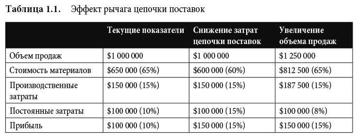 Поскольку затраты цепи поставок составляют значительную часть объема продаж компании, несложно догадаться, почему этой деятельности уделяется такое внимание. В результате возникает эффект рычага: каждый доллар, сэкономленный на цепочке поставок, отражается в конечном итоге в пропорциональном, а порой и гораздо более высоком увеличении доходов от продаж (зависит от прибыльности конкретной компании).